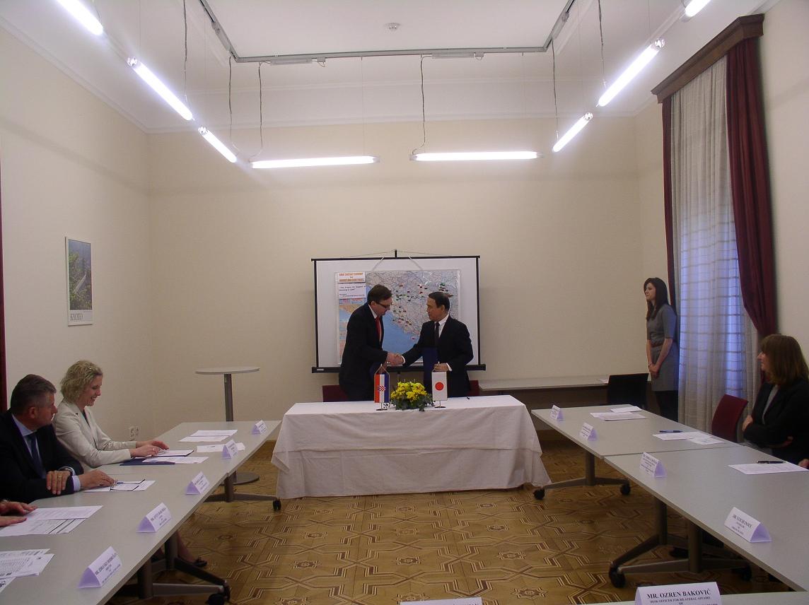 Representatives from the Croatian Ministry of Foreign and European Affairs, the County Prefect of Požega Slavonia County, Mayor of the City of Lipik and the Director of Croatian Mine Action Centre attended the Official ceremony of signing the Grant contract in Japan Embassy in Zagreb.