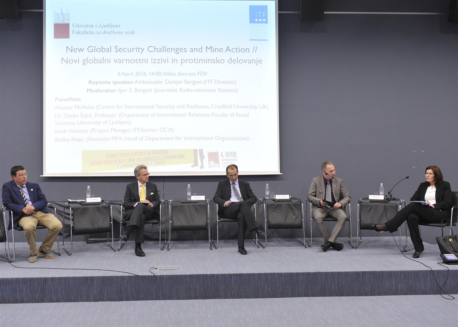 During the same week ITF also organized a round table addressing “New Global Security Challenges and Mine Action” that was moderated by Igor E. Bergant, national TV anchor. The views on the topic were shared by Mr Alastair McAslan from the Centre for International Security and Resilience, Cranfield University (UK), Prof. Dr. Zlatko Šabič from the Department of International Relations, Faculty of Social Sciences, University of Ljubljana (Slovenia), Ms Blažka Kepic from the Slovenian Ministry of Foreign Affairs, and Mr Iztok Hočevar as ITF and former Danish Church Aid Project Manager. Keynote address was delivered by Ambassador Damjan Bergant, ITF Director.