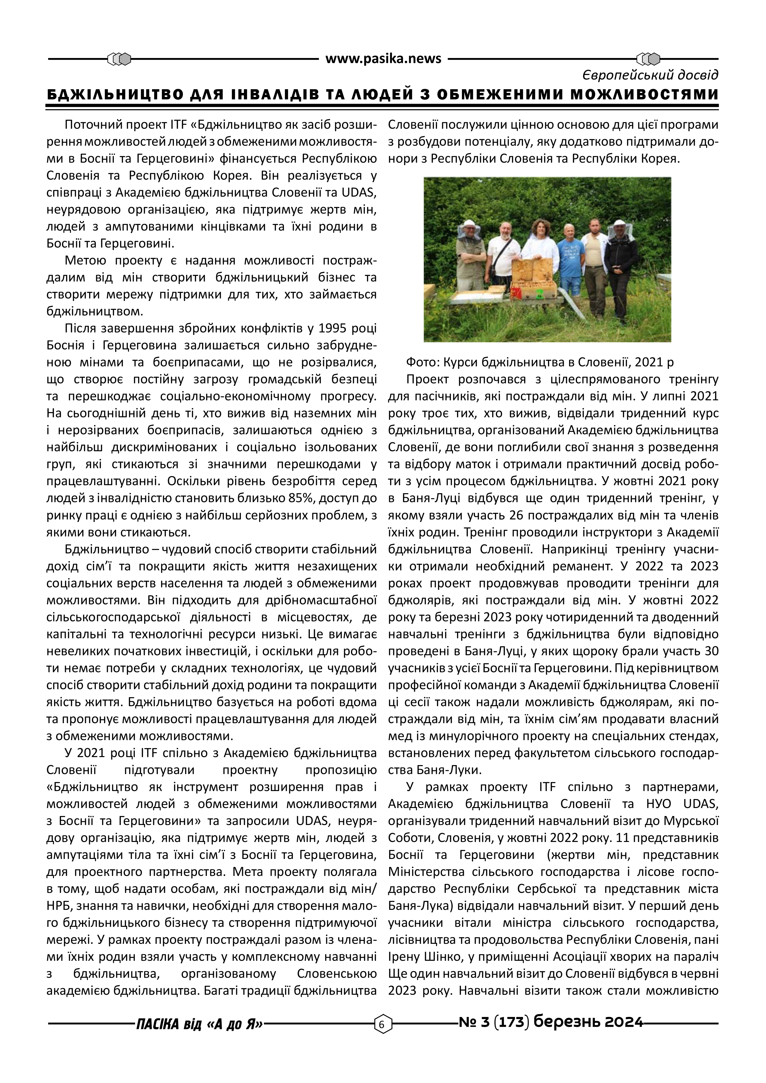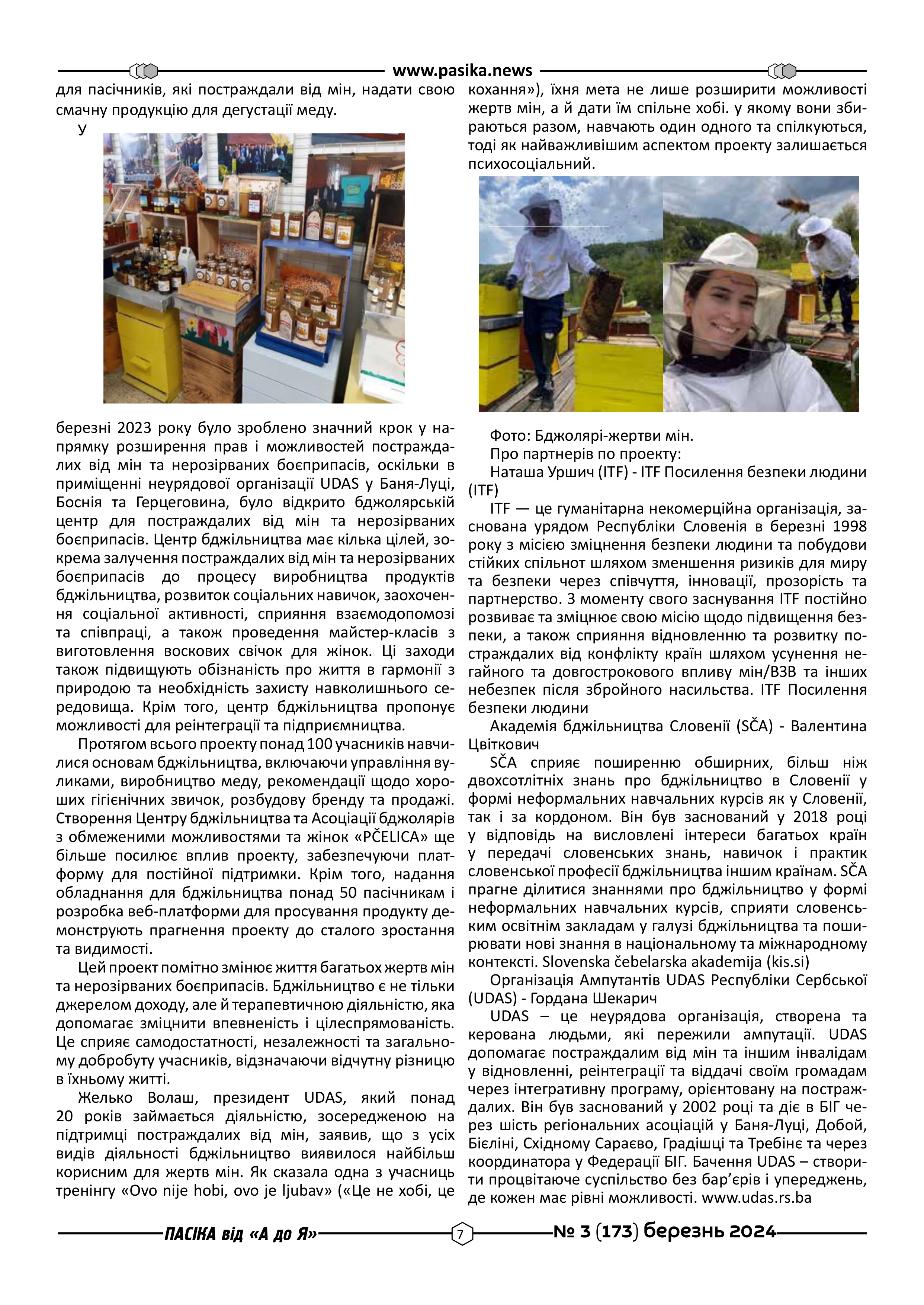 We are proud to see our initiatives are reaching people from far away as we work towards a world free of threats to peace and security, where safety, well-being, prosperity and dignity of individuals and communities is assured, with beekeeping serving as a significant empowering tool. Furthermore, we are delighted to invite you to read the article published in the latest issue of the Ukrainian newspaper specialized for beekeeping, available in both, English and Ukrainian. The article highlights our project 'Beekeeping as an Empowerment Tool for People with Disabilities in Bosnia and Herzegovina.'