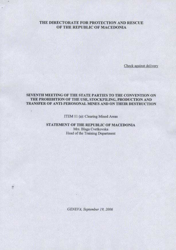 The Republic of Macedonia has shown itself as a credible member of international community by fulfilling the commitments made by signing of the Ottawa convention. Last anti-personnel mine suspected areas were reduced and cleared in clearance operations, which had taken place in period from June to September 2006. Operations, which followed the refreshment training course, were carried out by the Macedonian deminers under the Republic of Macedonia Protection and Rescue Directorate. A supervisor was additionaly provided by ITF to oversee implementation of these activities according to the guidelines, standards and operational procedures for humanitarian demining. These activities were financially supported by the Government of the United States of America through ITF. However, by successfully solving this problem, the Republic of Macedonia already intends to tackle yet another issue, which is extensive presence of explosive remnants of war from World Wars I and II in the southern regions, which requires a permanent national capacity. (Statement of the Republic of Macedonia)
