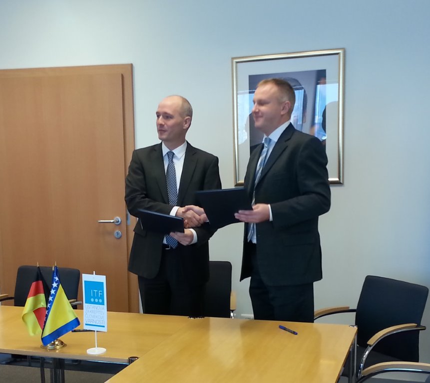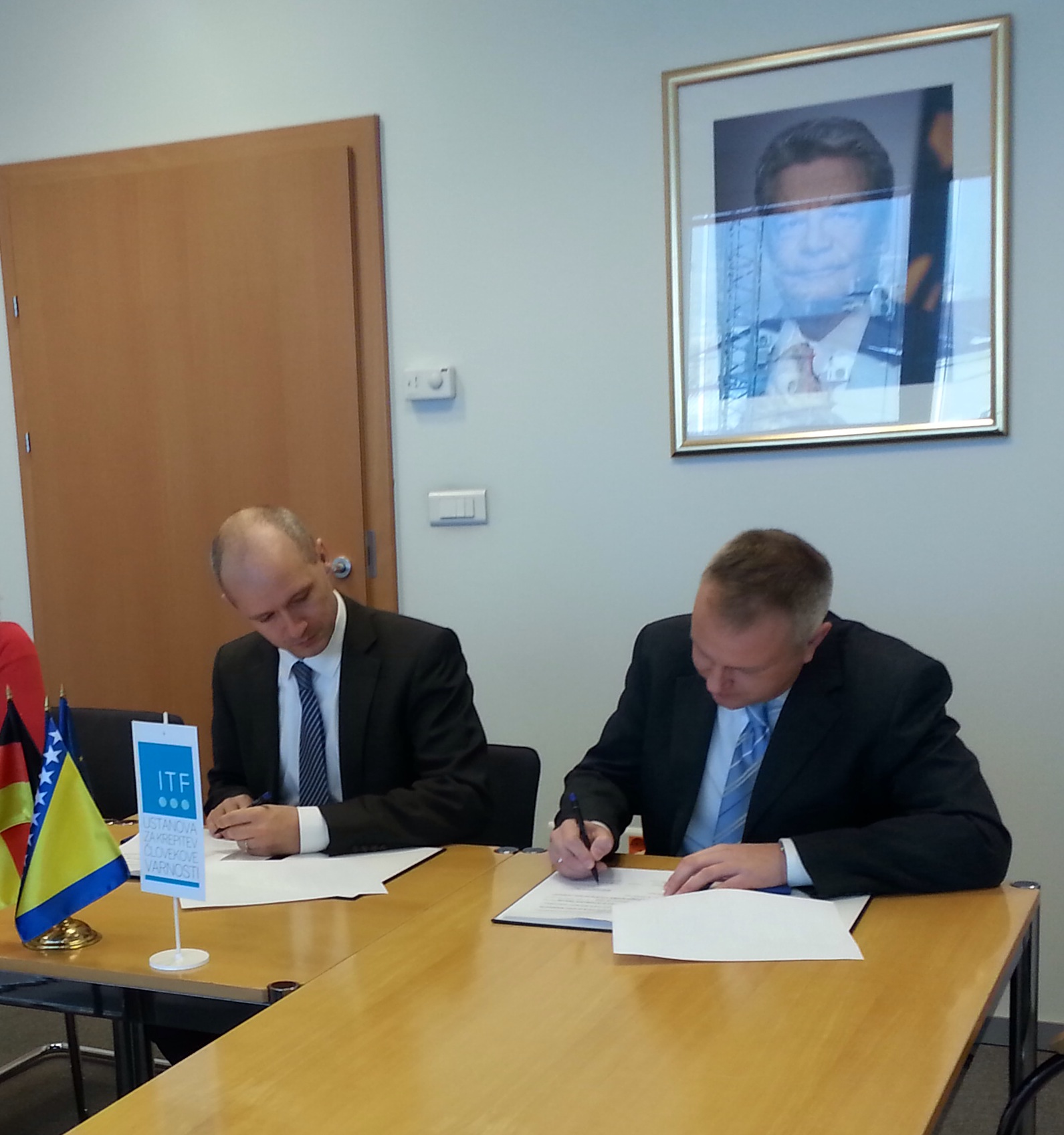 Sarajevo, 06 December 2013 – Mr. Adrian Pollmann, Deputy Head of Mission of Embassy of the Federal Republic of Germany in BiH and Mr. Gregor Sančanin, Head of ITF Implementation Office in BiH, signed an agreement for new additional funding of 400.000,00 EUR, which shall be implemented through ITF Enhancing Human Security in 2014 for projects of demining and technical survey in BiH - in Municipalities of Han Pijesak, Konjic, Pelagićevo, Zvornik, Rogatica and Kalesija.