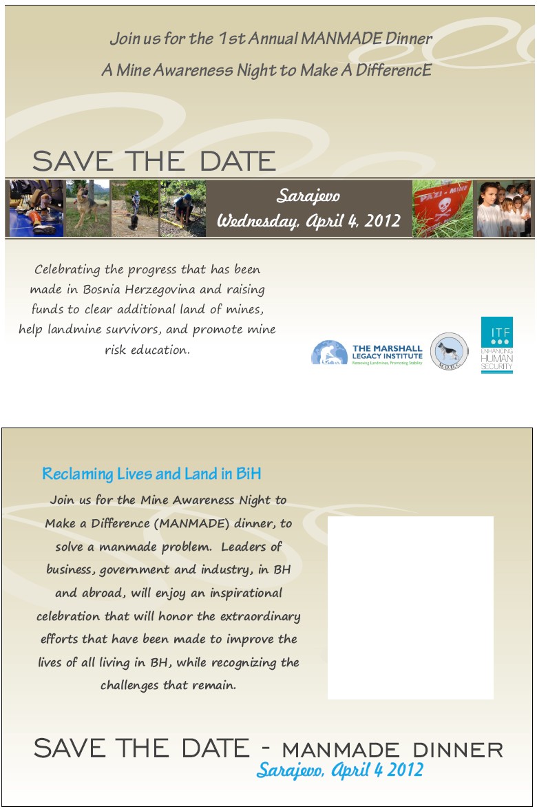 MANMADE Dinner will be held on April 4th 2012 at the Hotel Holiday Inn in Sarajevo. Proceeds, matched by U.S. Department of State, The Office of Weapons Removal and Abatement (PM/WRA) throgh ITF, will support three distinct projects in communities threatened by landmines in BiH: (1) Mine Risk Education, (2) Survivors’ Assistance (a group of young landmine survivors will receive medical assistance and prosthetic limbs); and (3) Landmine Clearance (a special plot of land now contaminated with mines will be cleared).