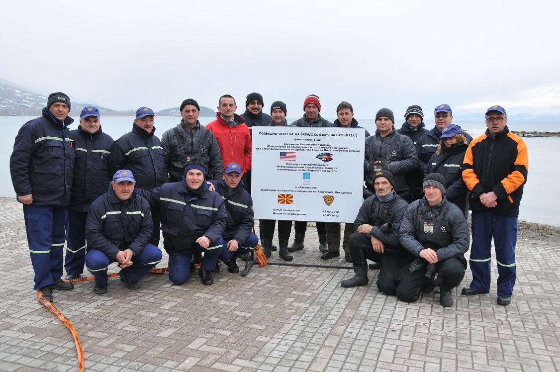 The 3rd Phase of Underwater UXO Clearance of Lake Ohrid (locations: Ohrid Harbor and Peshtani) has started on 22 February 2012 and is financed by United States Department of State, Bureau of Political-Military Affairs, Office of Weapons Removal and Abatement (PM/WRA), through ITF. The 3rd phase will last for 28 operational days and is implemented by specialized diving teams for underwater demining and EOD specialists from Republic of Macedonia Protection and Rescue Directorate and supervised by P.E.D. Sava d.o.o. The continuation of the project draws to a large extent from experience gained during first two clearance phases in 2010 and 2011 when more than 15 tons of dangereous UXO were removed and destroyed together with approximately 3.4 tons of other metal pieces (garbage).