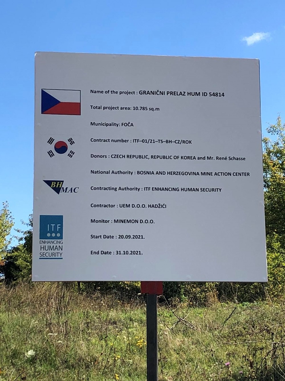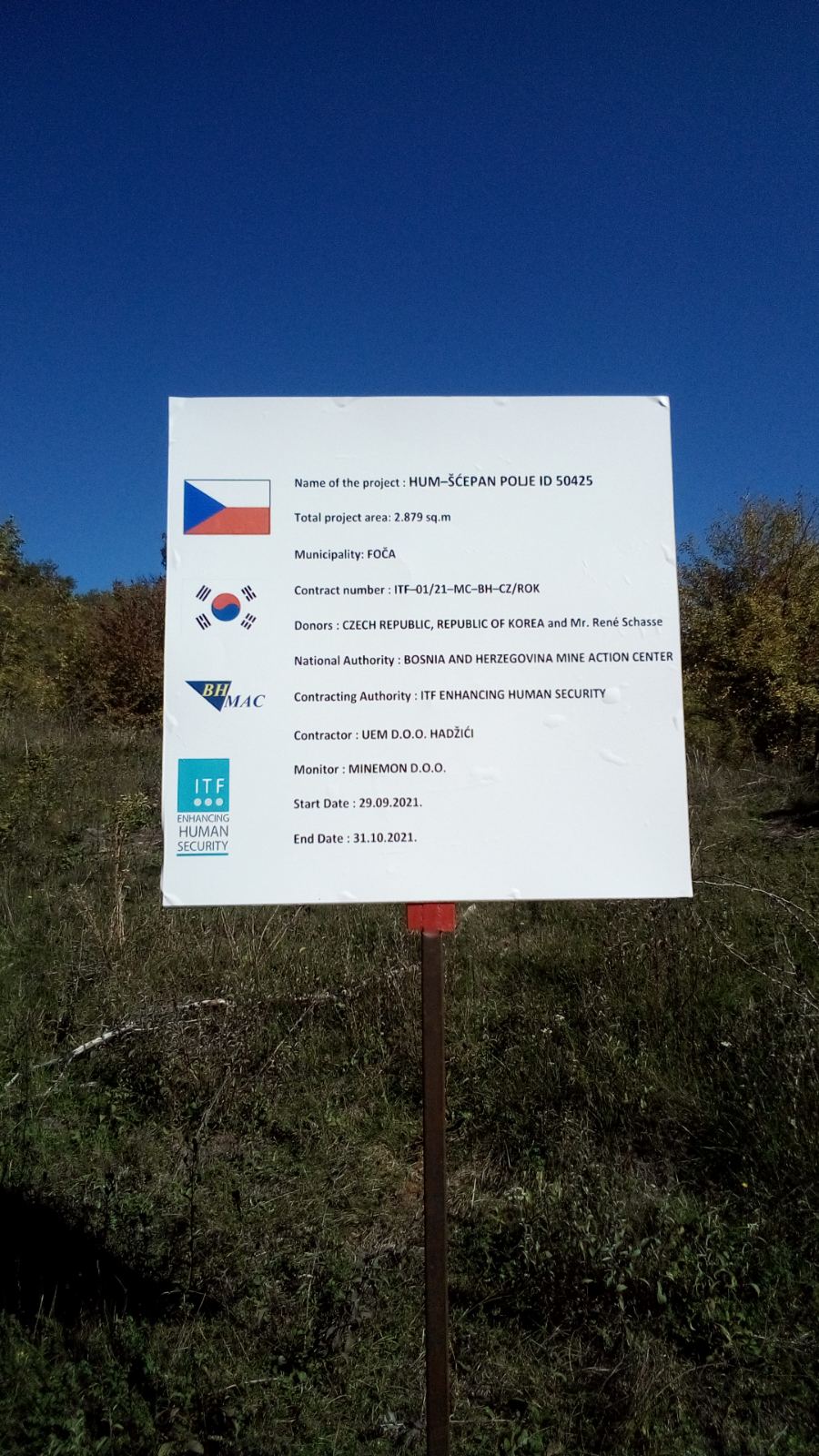 Until recently, the ‘beware mines’ warning signs still informed and drew attention to the passengers that they are in immediate vicinity of mine suspected areas, right next to the border crossing Hum - Šćepan polje connecting Bosnia and Herzegovina with Montenegro. However now, thanks to the generous donations of Czech Republic, Republic of Korea and a private donor, Mr. Rene Schasse, PhD, the two demining projects have been successfully completed, releasing 13,664 square meters of land and removing 2 mines.