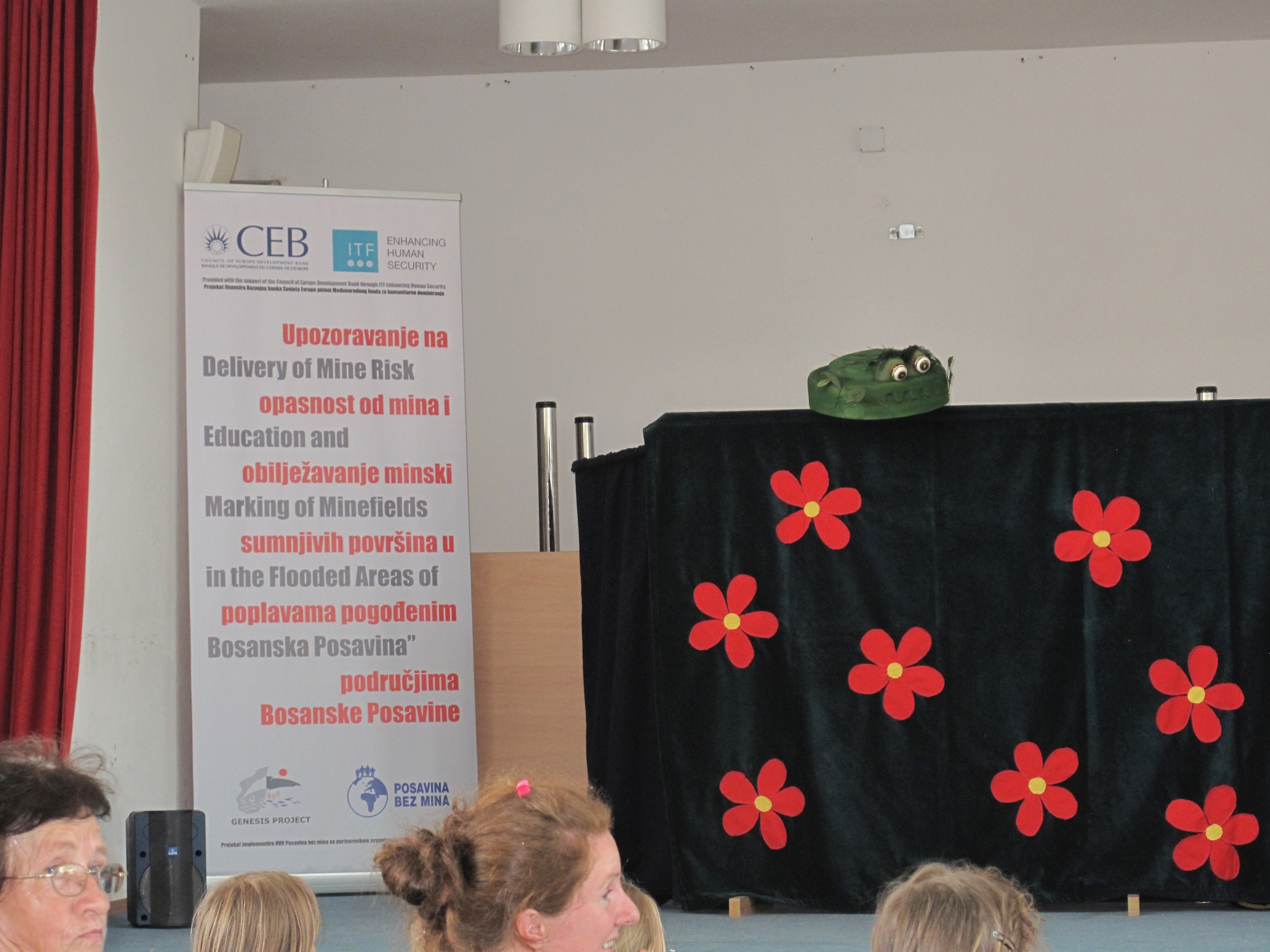 On 10 September 2014 Mr. Stephan Sellen, Deputy Director General, Directorate General for Loans and Social Development and Ms. Jasmina Glisovic, Country Manager, Directorate General for Loans and Social Development of Council of Europe Development Bank – CEB together with ITF Enhancing Human security staff visited village Kovačiča, community Živinice in Tuzla Canton where the community area is affected with 12 landslides, out of which 7 are within mine suspected area. Second location which was visited is village Palanka in Brčko District where river Sava flooded several mine suspected areas - therefore urgent marking and mine risk awareness MRA is needed. Mine risk awareness (MRA) puppet show was presented to CEB and ITF representatives who were joined by children from village Palanka.